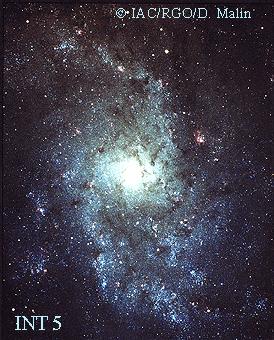 La galaxie spirale M33 du groupe local. La photo est une image composite faite par David Malin à partir de plaques obtenues au télescope Isaac Newton aux Canaries. |
